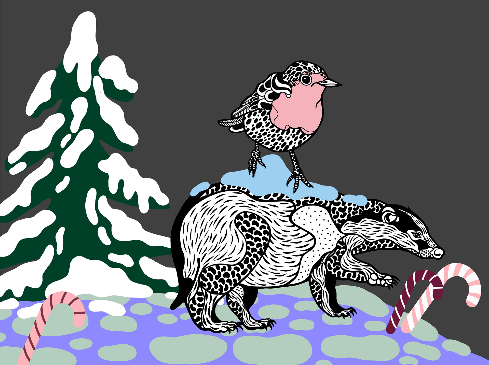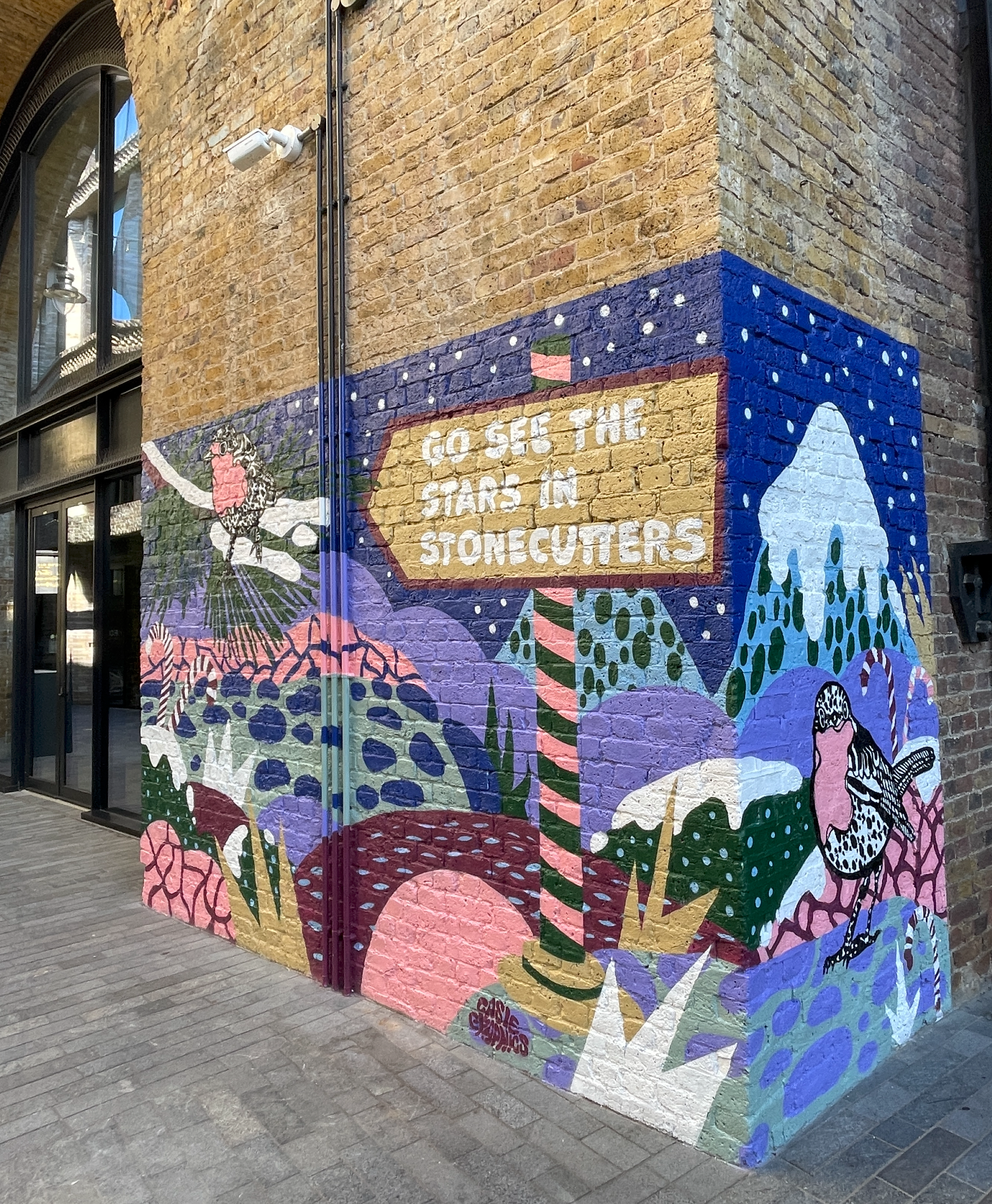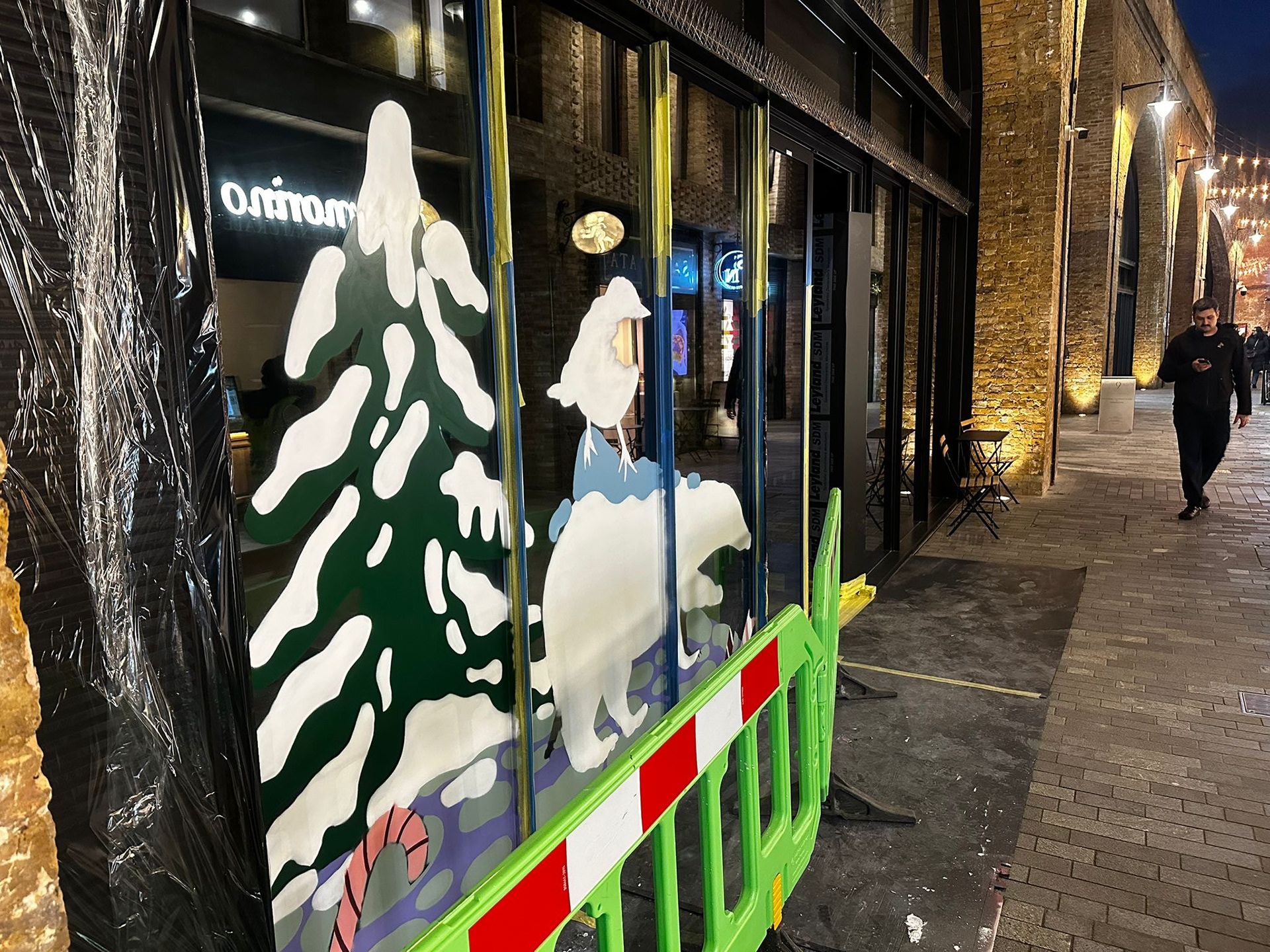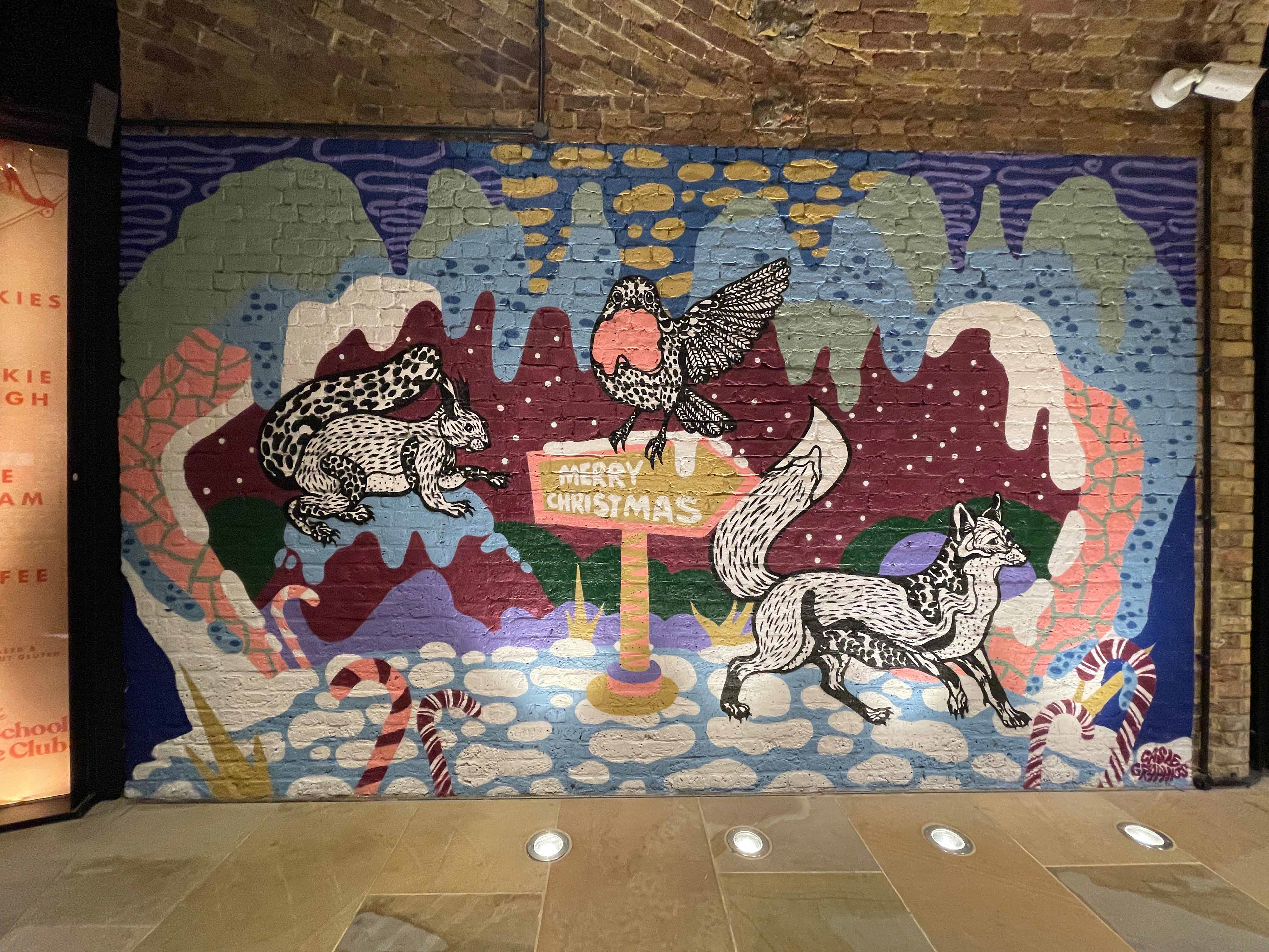 A small robin appears throughout the trail as a gentle guide, leading visitors alongside different winter animals towards a central Christmas tree. The illustrations were designed by the artist and realised on site as spray-painted artworks by Global Street Artists. The project focuses on a calm, magical winter atmosphere with bold graphic elements and subtle surreal details.