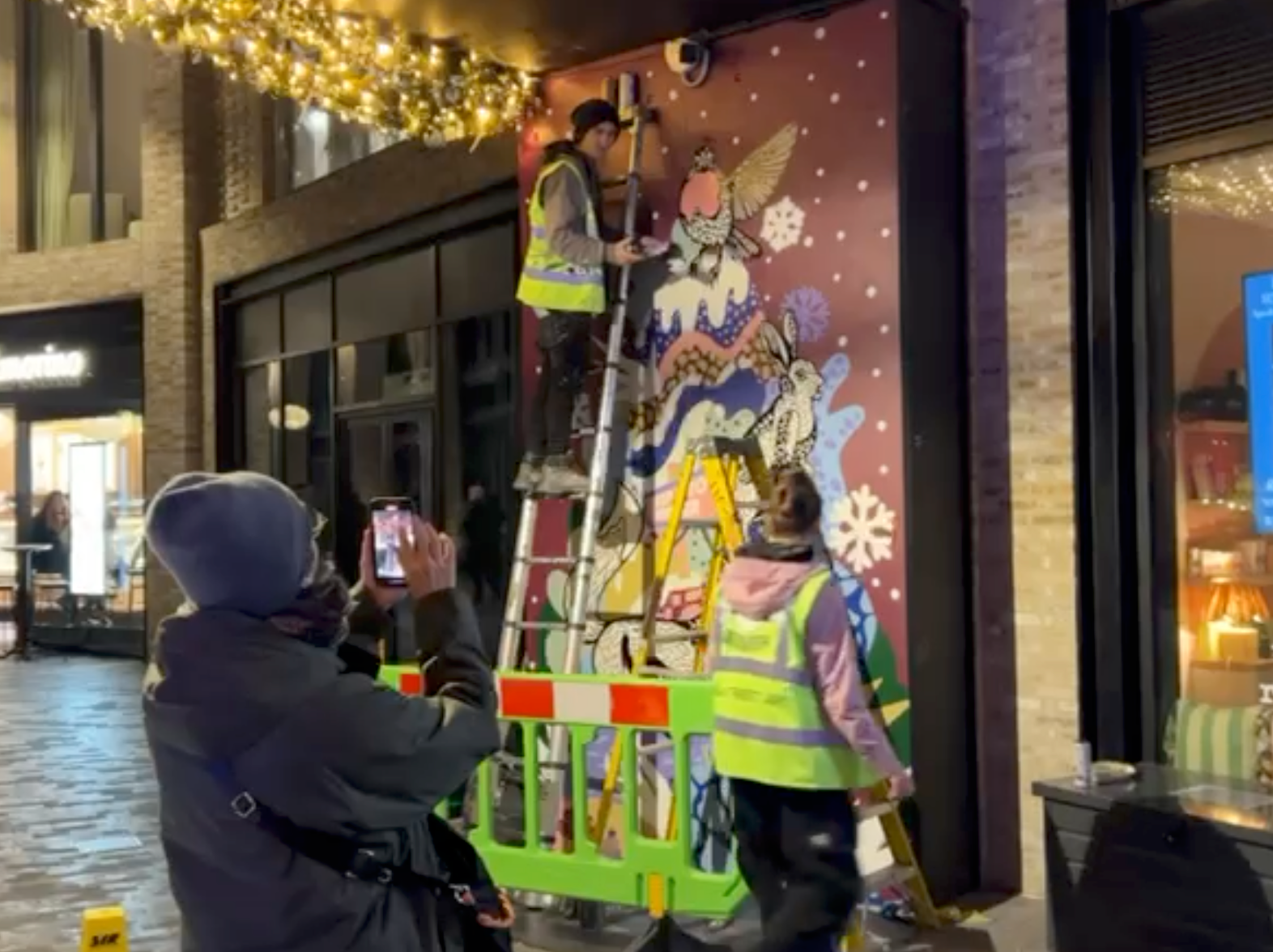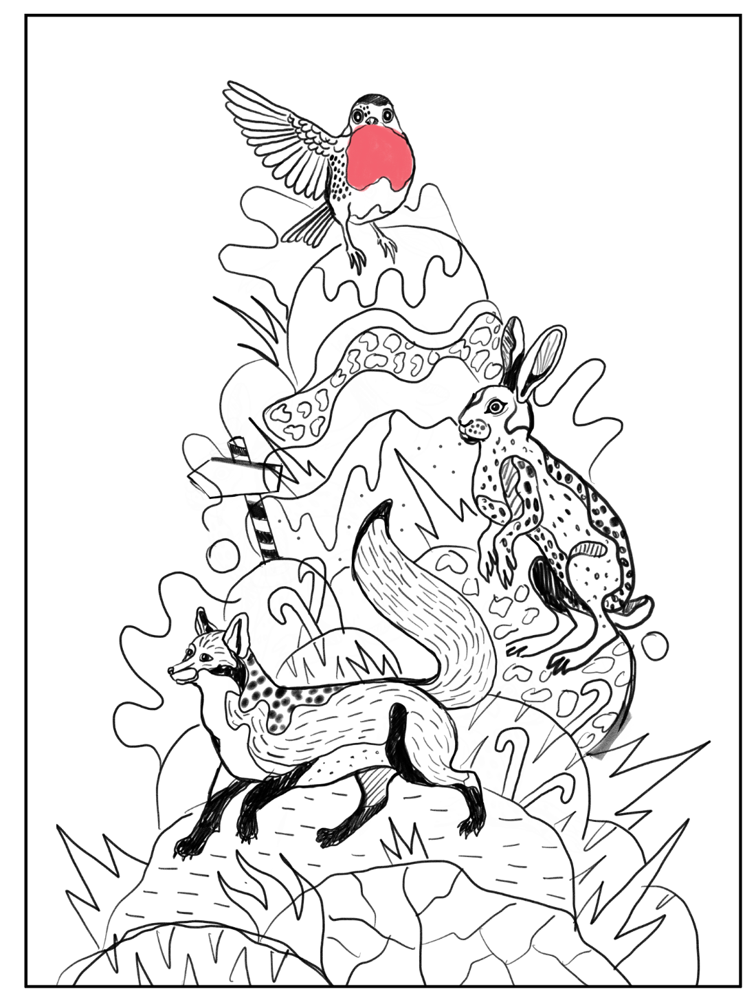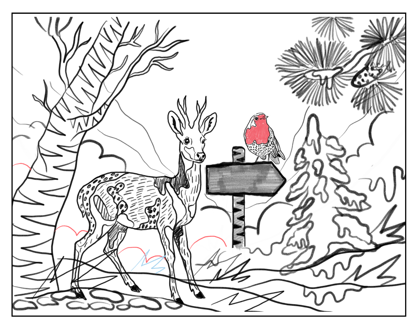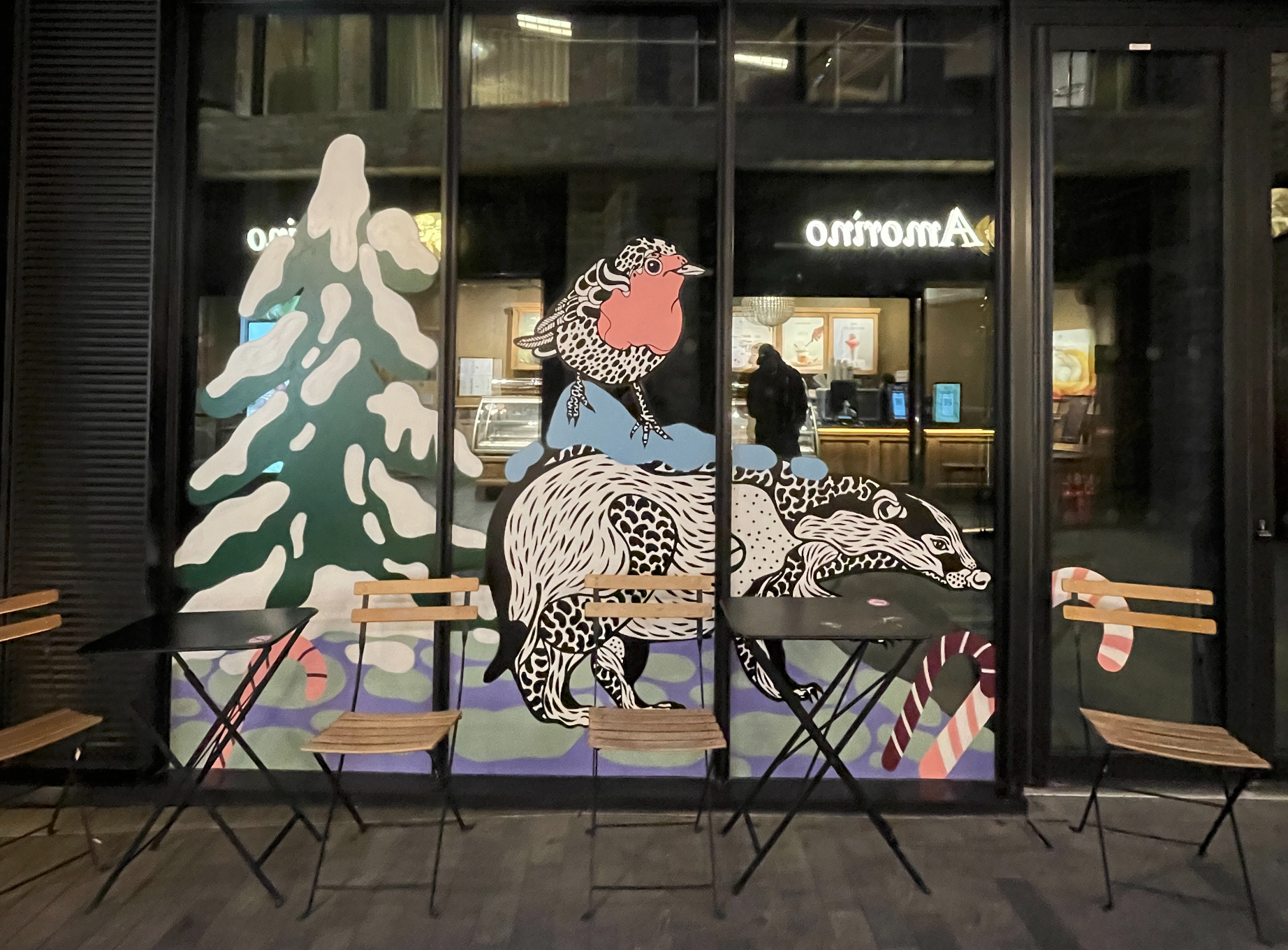 A small robin appears throughout the trail as a gentle guide, leading visitors alongside different winter animals towards a central Christmas tree. The illustrations were designed by the artist and realised on site as spray-painted artworks by Global Street Artists. The project focuses on a calm, magical winter atmosphere with bold graphic elements and subtle surreal details.