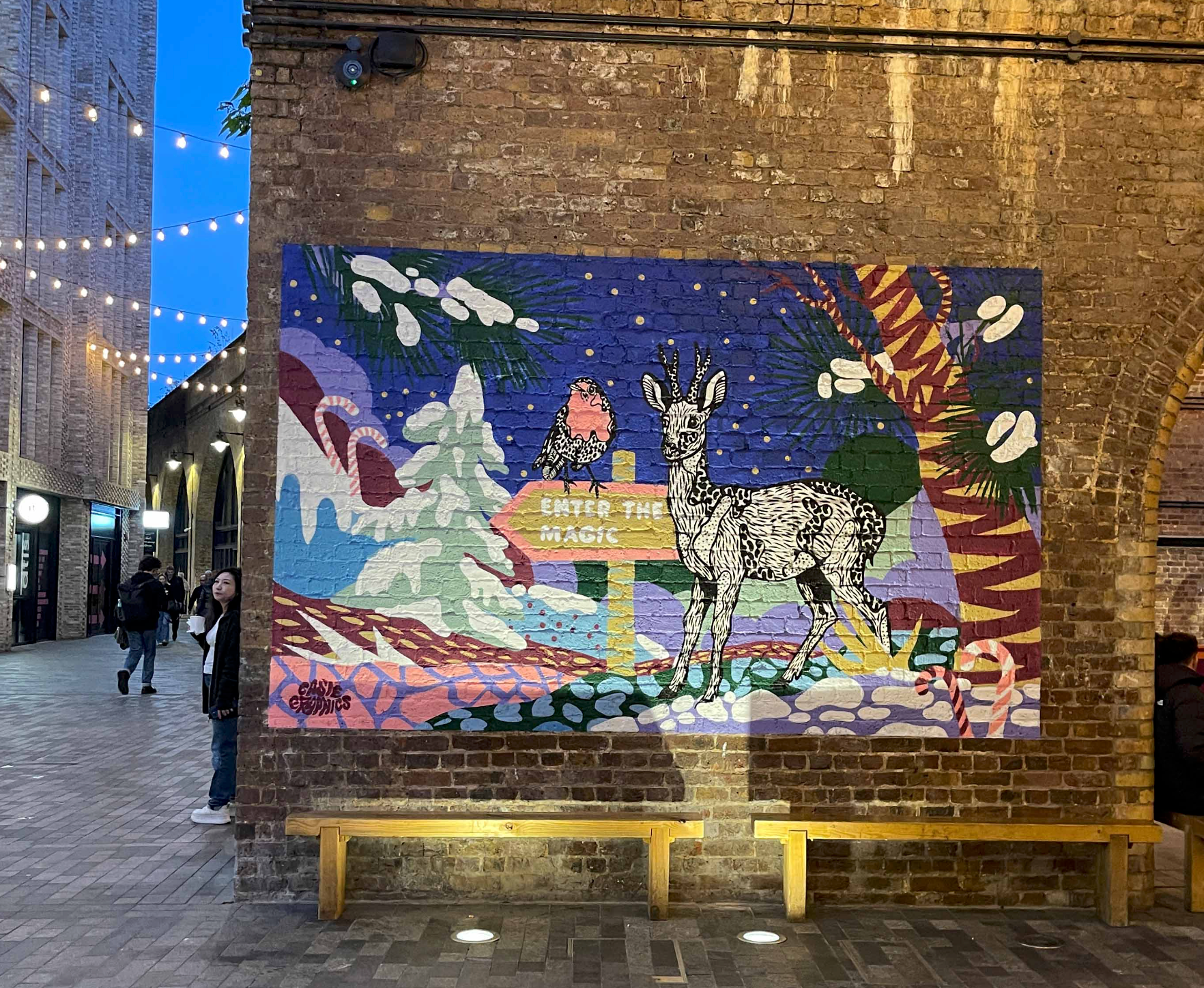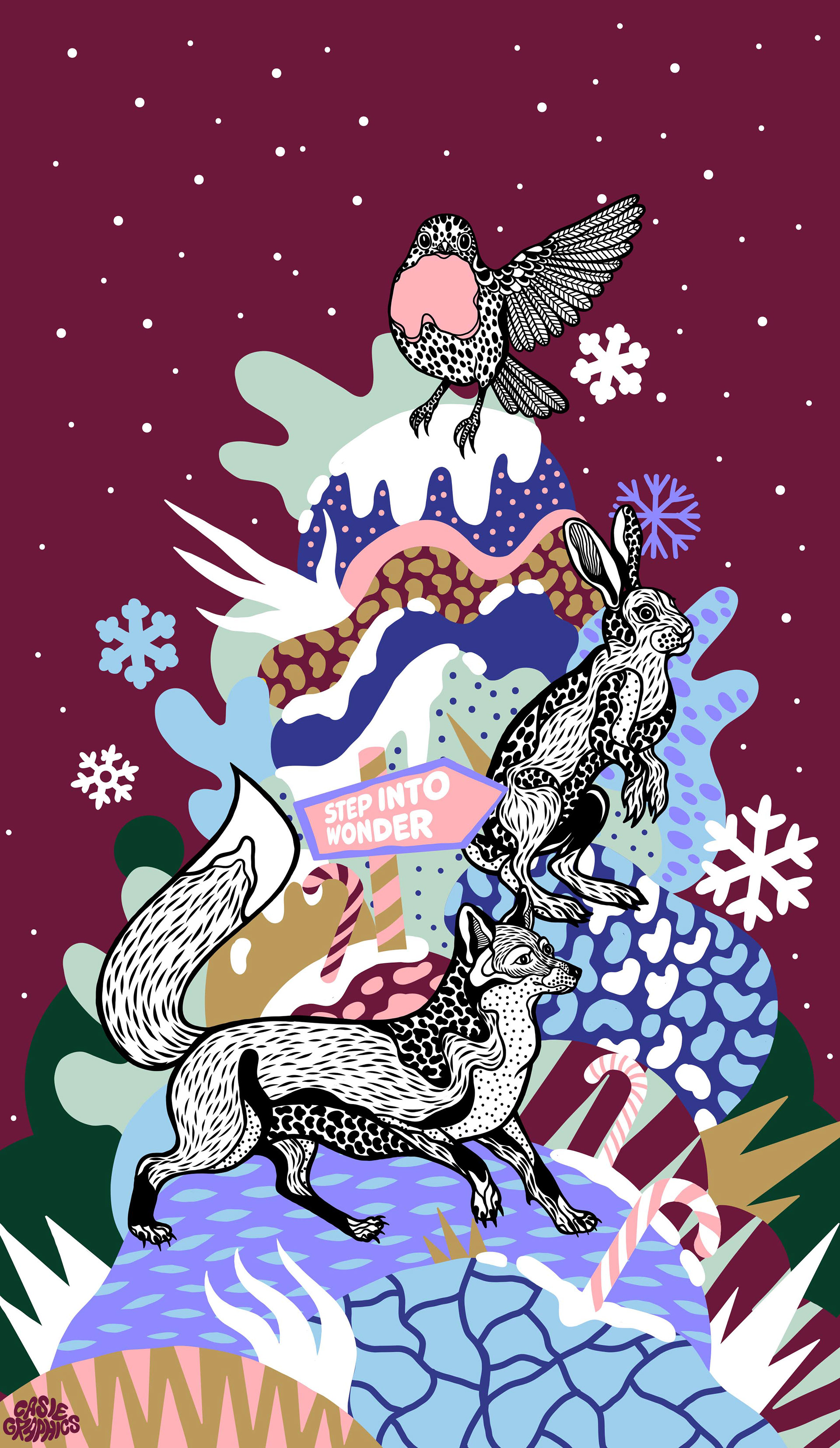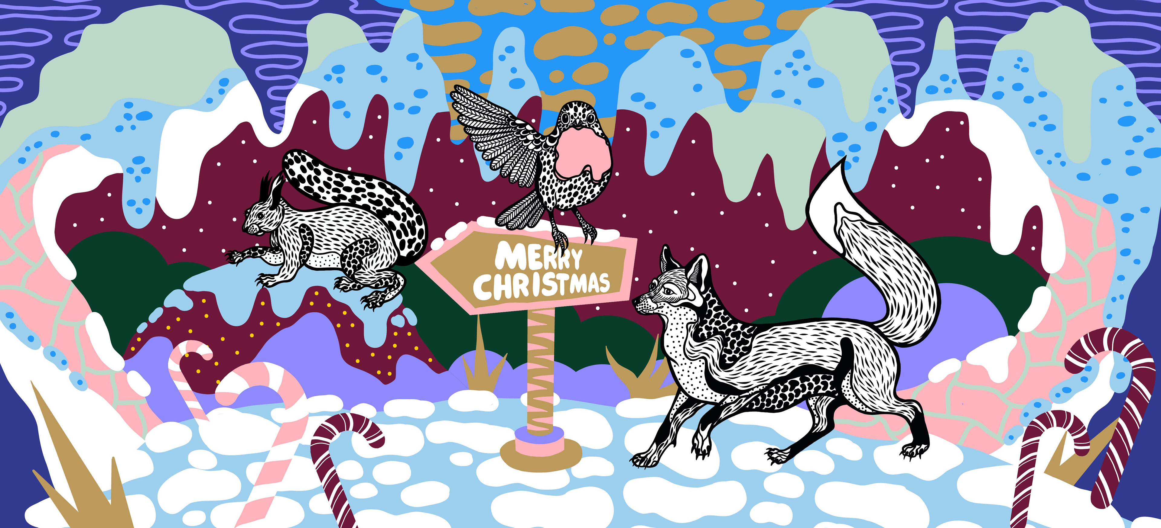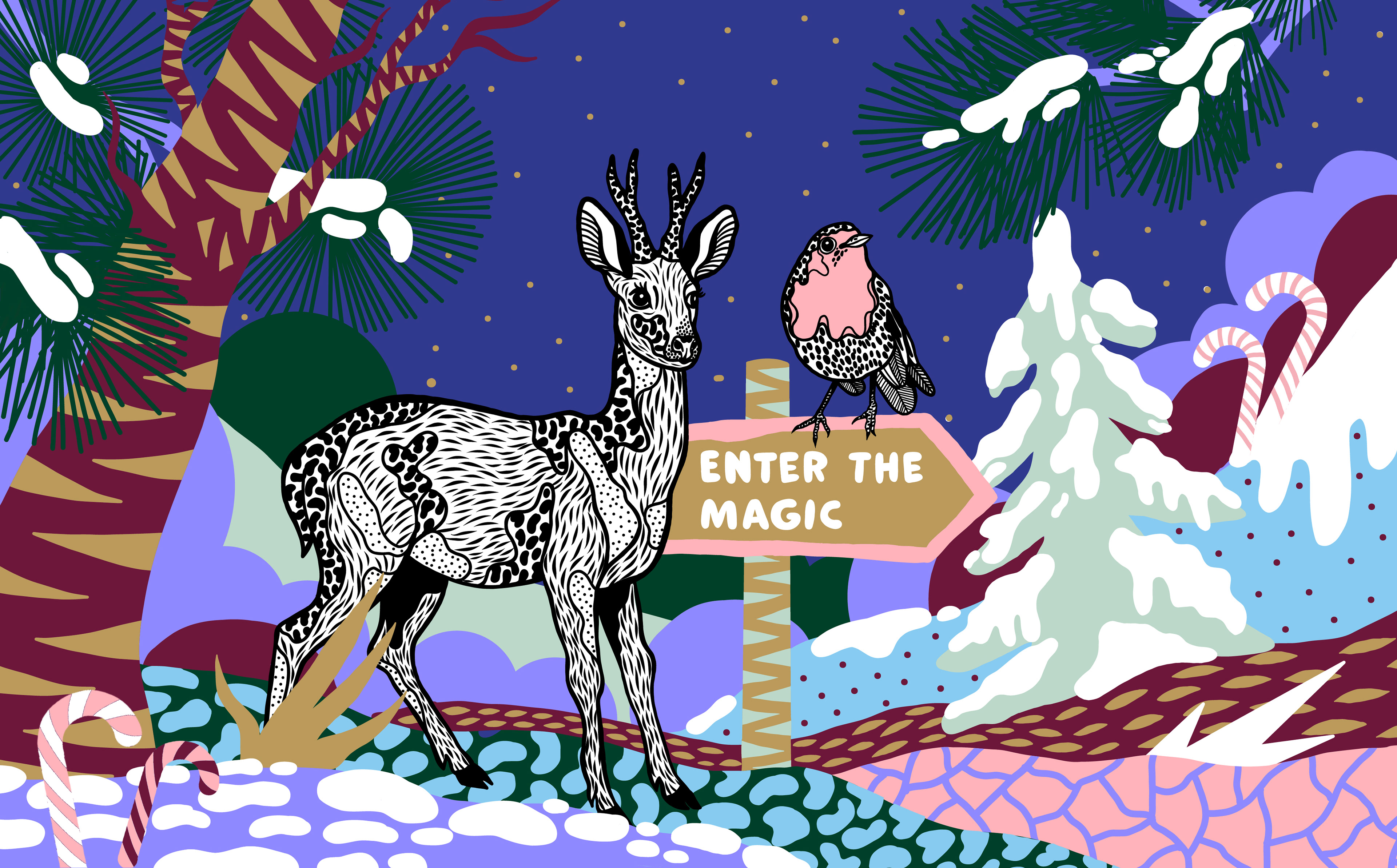 Magical Creatures is an illustration project created for Borough Yards as part of a winter activation at London Bridge. The project features a series of 5 artistic wayfinding artworks that guide visitors through the space using animals.