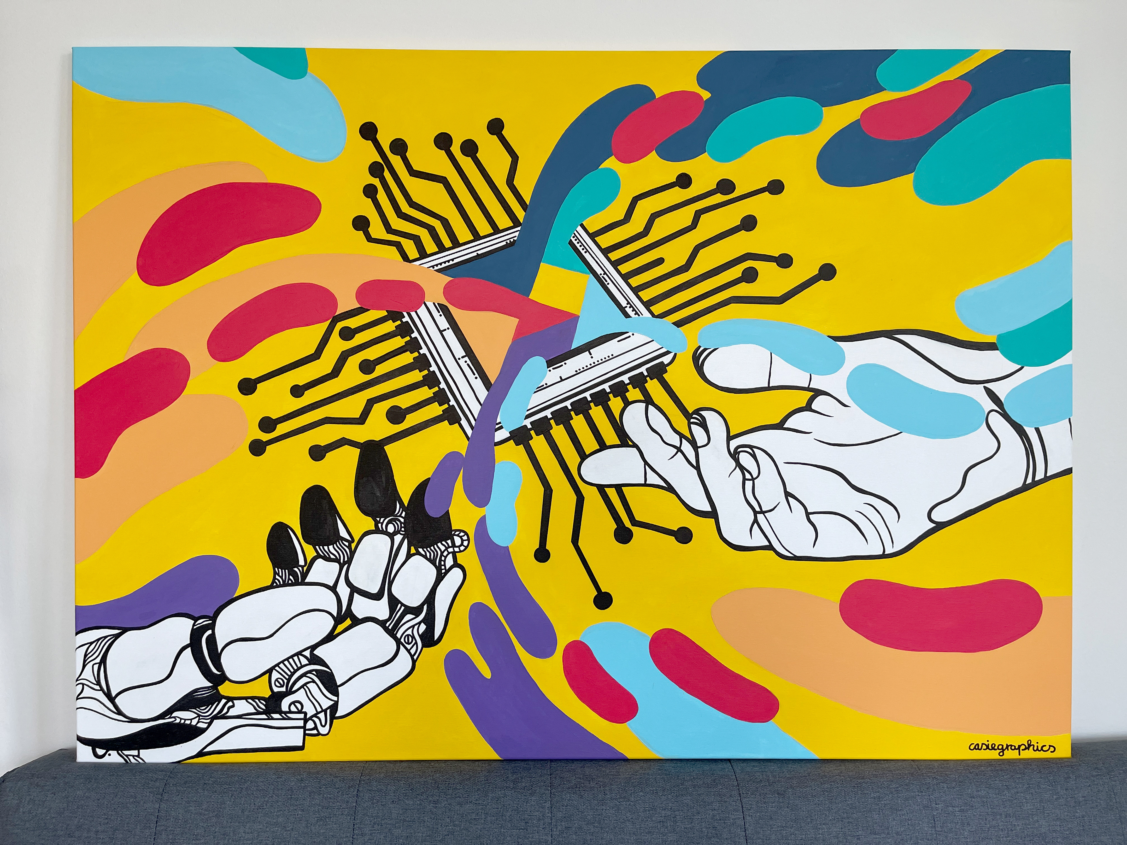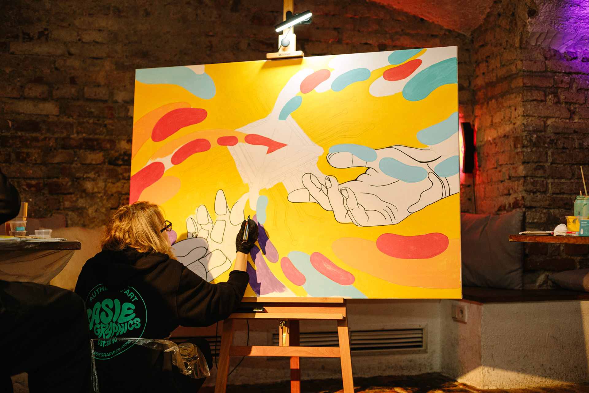 For a corporate event by DataArt in Munich, I created a live painting on canvas and hosted an acrylic painting workshop for employees. The canvas, measuring 140 × 100 cm, was painted live on site during the event, allowing guests to follow the creative process in real time.